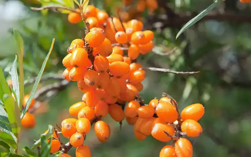 Sanddorn, lat. Elaeagnaceae, wird auch als Zitrone des Nordens bezeichnet. Das fetthaltige Sanddornfruchtfleischöl fördert die Wundheilung und Epithelisierung. Es wird bei Verbrennungen und Sonnenbrand eingesetzt. Sanddornfruchtfleischöl wirkt zellregenerierend, entzündungshemmend und antioxidativ und regt die hauteigenen Stoffwechselprozesse an. Darüber hinaus beruhigt es stark beanspruchte Haut und spendet Feuchtigkeit.